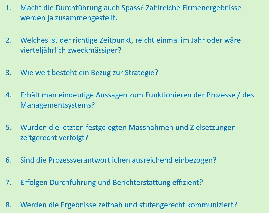 Vor dem Beginn des diesjährigen Managementreviews könnte man dieses selbst reviewen, u.a. mittels folgender Kriterien: